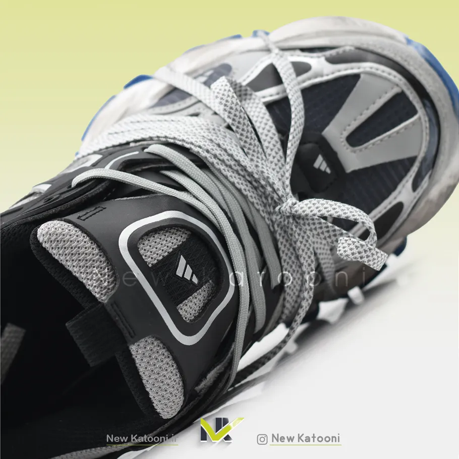 بخش رویه از نظر بصری بسیار غنی و لایهلایه است. بخش اصلی رویه آدیداس رانر دلوکس از توری مشبک (Mesh) سبک ساخته شده که تنفس پا را تأمین میکند. اما جذابیت اصلی در پوششهای متعدد آن است که از چرم مصنوعی، جیر و پلاستیک تشکیل شدهاند. این لایهها در کنار یکدیگر، ساختاری محکم، بادوام و همینطور شلوغ و درهم ایجاد میکنند که کاملاً یادآور کفشهای مهندسیشده و پرتراکم دهههای گذشته است. این لایهبندی نه تنها وظیفه تأمین ساختار و پشتیبانی از پا را بر عهده دارد، بلکه با ایجاد عمق و بافتهای متنوع، ویژگی حجیم و فنی (Technical) کفش را برجسته میسازد. جزئیات ظریفی مانند نوارهای سهگانه آدیداس، بُعد استایلی این رویه را تکمیل میکنند و بر ماهیت خاص آن تاکید دارند. این مدل اغلب با بندهای فوقبلند (Extra-long Laces) عرضه میشود که به عمد برای اورسایز دیده شدن و افزودن جلوهای نمایشی به استایل طراحی شدهاند.