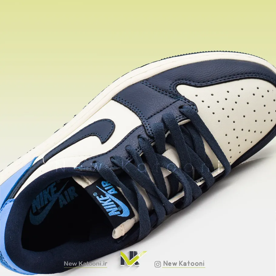 پالت رنگی این مدل، ترکیبی هنرمندانه و مسحورکننده از سه رنگ سرمهای، آبی و کرم است که در کنار هم، یک اثر هنری مدرن را خلق کردهاند. رنگ اصلی “Obsidian” یا همان آبی سرمهای عمیق، که نام این کتانی نیز از آن گرفته شده، حسی از آرامش، قدرت و لوکس بودن را منتقل میکند. این رنگ در قسمتهای رویه کفش، پنلهای جانبی و پاشنه به کار رفته است. در کنار آن، رنگ “Powder Blue” یا همان آبی روشن پاستلی، در قسمت رویه و لوگوی نایک (Swoosh)، یک کنتراست ظریف و جذاب ایجاد کرده که حس طراوت و تازگی را به طراحی کلاسیک این کفش میبخشد. جنس چرم مرغوب، نهتنها زیبایی این رنگها را دوچندان میکند، بلکه دوام و طول عمر آن را تضمین میکند و با هر بار پوشیدن، زیبایی خود را بیشتر نشان میدهد.