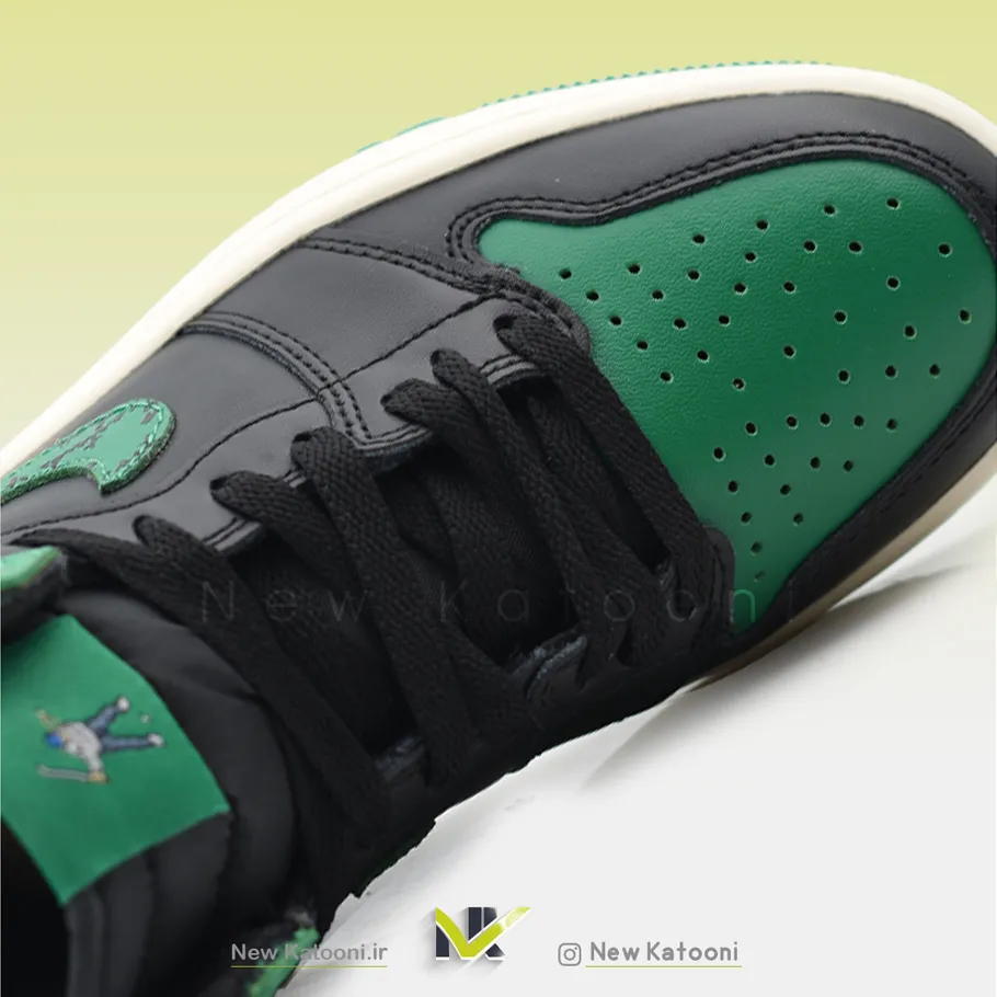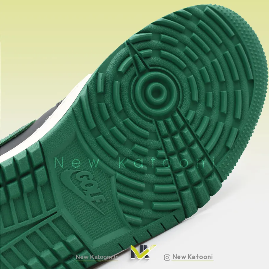 رویه این کفش از چرم مصنوعی با کیفیت ساخته شده است که هم از لحاظ ظاهری جذاب و شیک است و هم از نظر دوام و راحتی عملکرد بالایی دارد. طراحی رویه، از آن جایی که برگرفته از سبک کلاسیک ایر جردن 1 است، دارای خطوط مشخص و زاویهدار است که بهخوبی ترکیبشدهاند تا نمایی خاص و چشمنواز داشته باشند. رنگبندی خاص و زیبا که شامل مشکی، سفید و سبز است، بهخوبی با دنیای گلف ارتباط برقرار کرده و به این کفش شخصیتی منحصر به فرد میبخشد. استفاده از رنگ سبز که در بسیاری از لوازم گلف و همچنین چمن گلف مشاهده میشود، نشان از الهام گرفتن این کفش از دنیای گلف دارد.