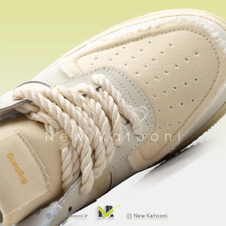 اما در نایک ایر فورس 1 لو بیگ بنگ آنچه مهم تر شده، زیبایی و جذابیت بیشتر داده به کفش است. بنابراین نایکی با استفاده از این بند طنابی به همه گفته است که از امتحان کردن طراحی های جدید نمی ترسد.