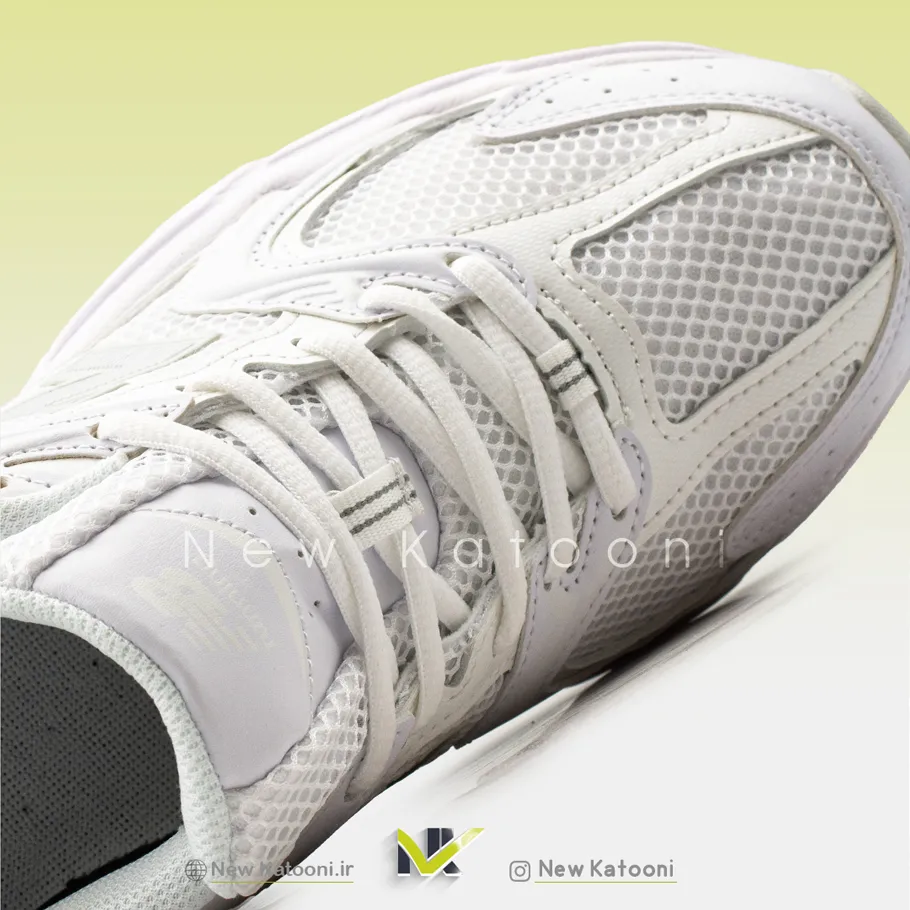 وقتی برای اولین بار کفش نیوبالانس 530 را از جعبه بیرون میآورید، ظاهر تمیز و طراحی مینیمالش بلافاصله توجه شما را جلب میکند. ترکیب رنگ سفید و شیری ساده است اما چشمنواز؛ این کفش به راحتی نگاهتان را برای چند ثانیه روی خودش نگه میدارد. بافت پارچهای رویه، میان انگشتانتان زبری نرم و خوشایندی دارد، ترکیبیست از لطافت و انسجام؛ نه بیش از حد نرم، نه خشک و بیجان. کنارههای کفش با خطوط نقرهای براق قاب گرفته شدهاند، گویا بدون نیاز به ظاهر براق و فریبنده، کارآیی و اطمینان از خود را فریاد میزند.
